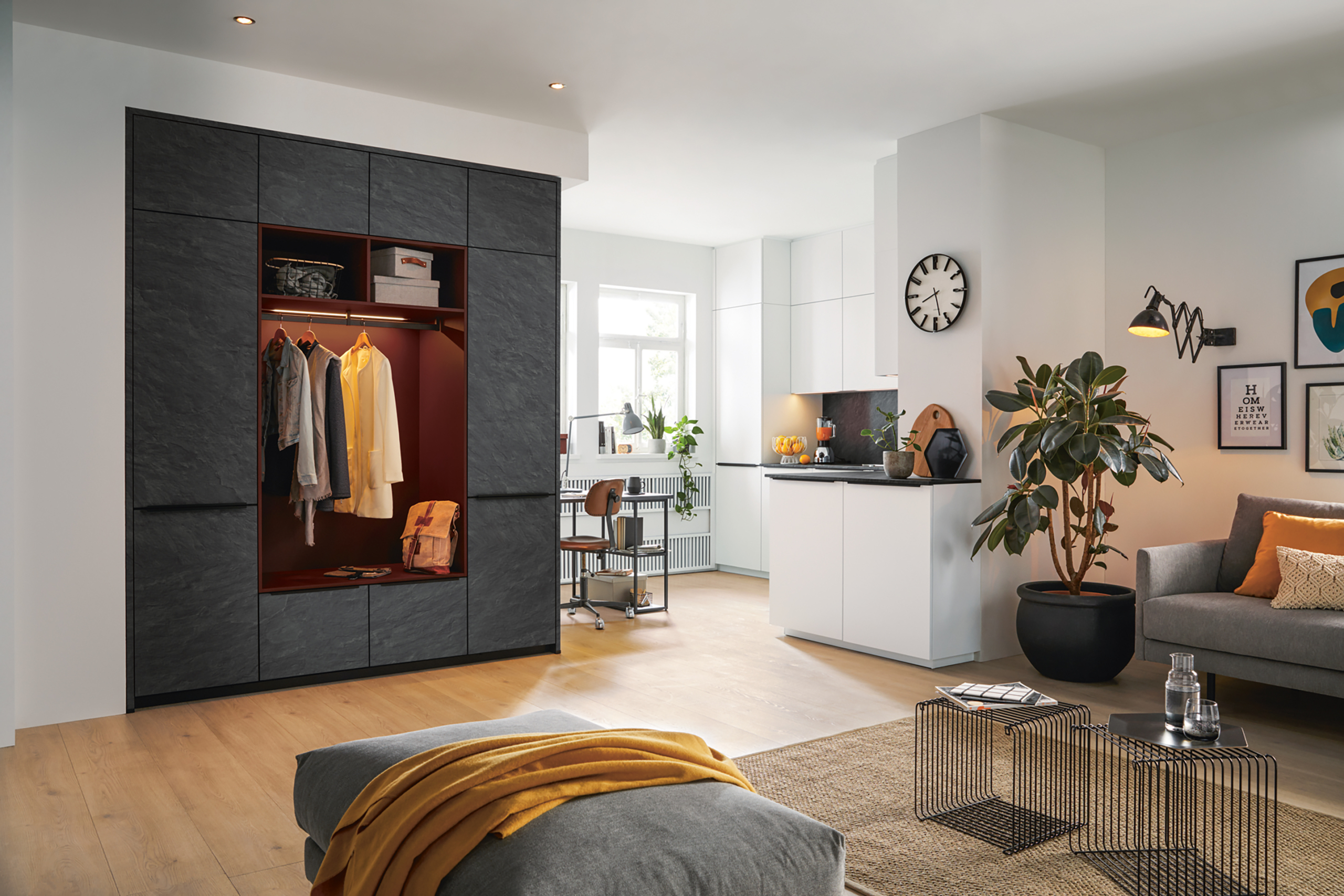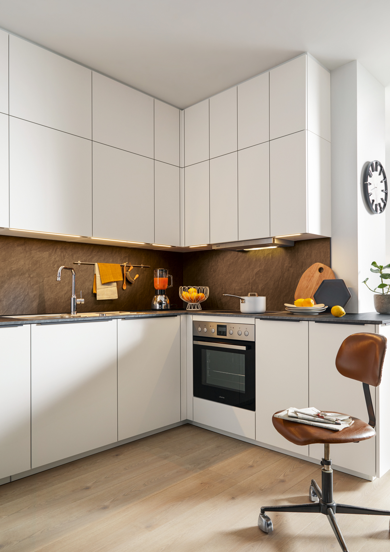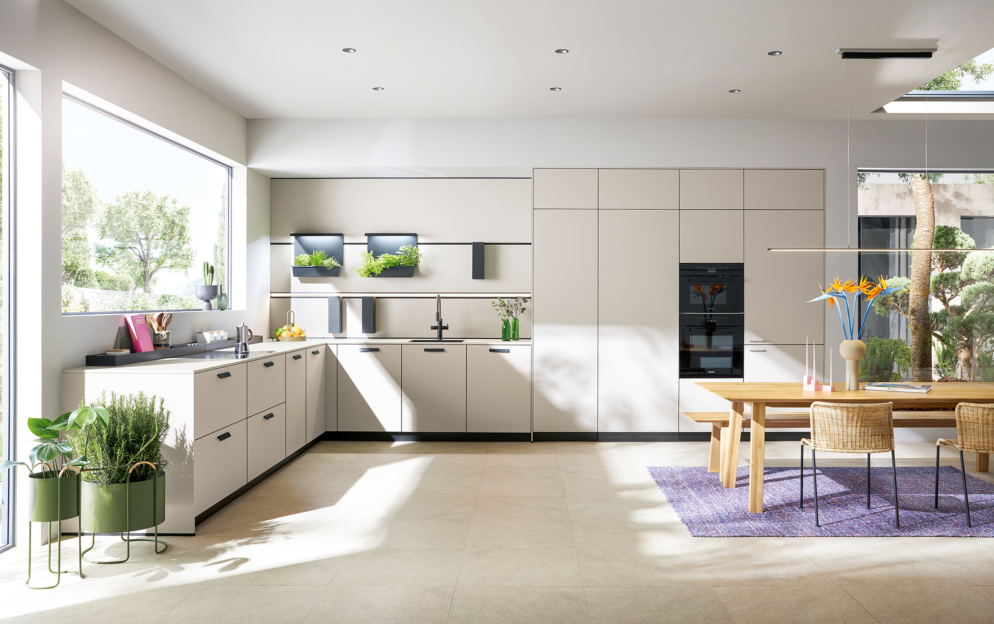Kuhinja Schüller Fino Matt ima besprekoran mat UV lak, dostupan u 8 boja sa AFP tehnologijom protiv otiska prstiju.