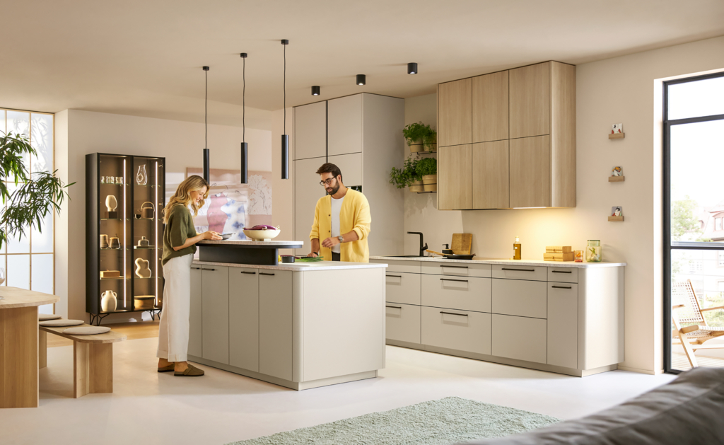 Schüller Salona, gde se japanski minimalizam susreće sa skandinavskom “hygge” toplinom. Meke linije, zaobljeni paneli i mat AFP finiš stvaraju miran dom.